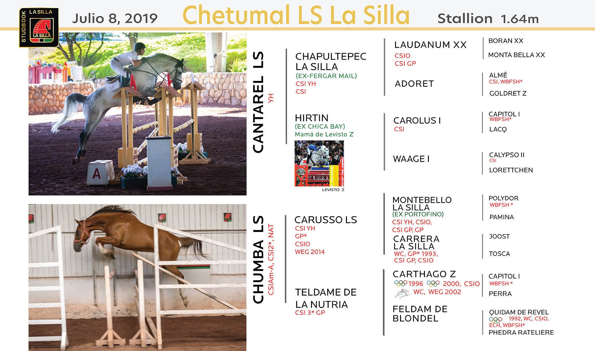 -Madre del semental (Ex Levisto La Silla) (nivel 1.60m), quien ganó 4to.Lugar en el Gran Premio de Helsinki (FIN) en 2005, 6to.Lugar en el Gran Premio de Helsinki (FIN) en 2006 , 7mo.Lugar en el Gran Premio CSI 4* de Wiesbaden (GER) en 2009 montado por Judy Ann Melchior(GER) entre muchos más.