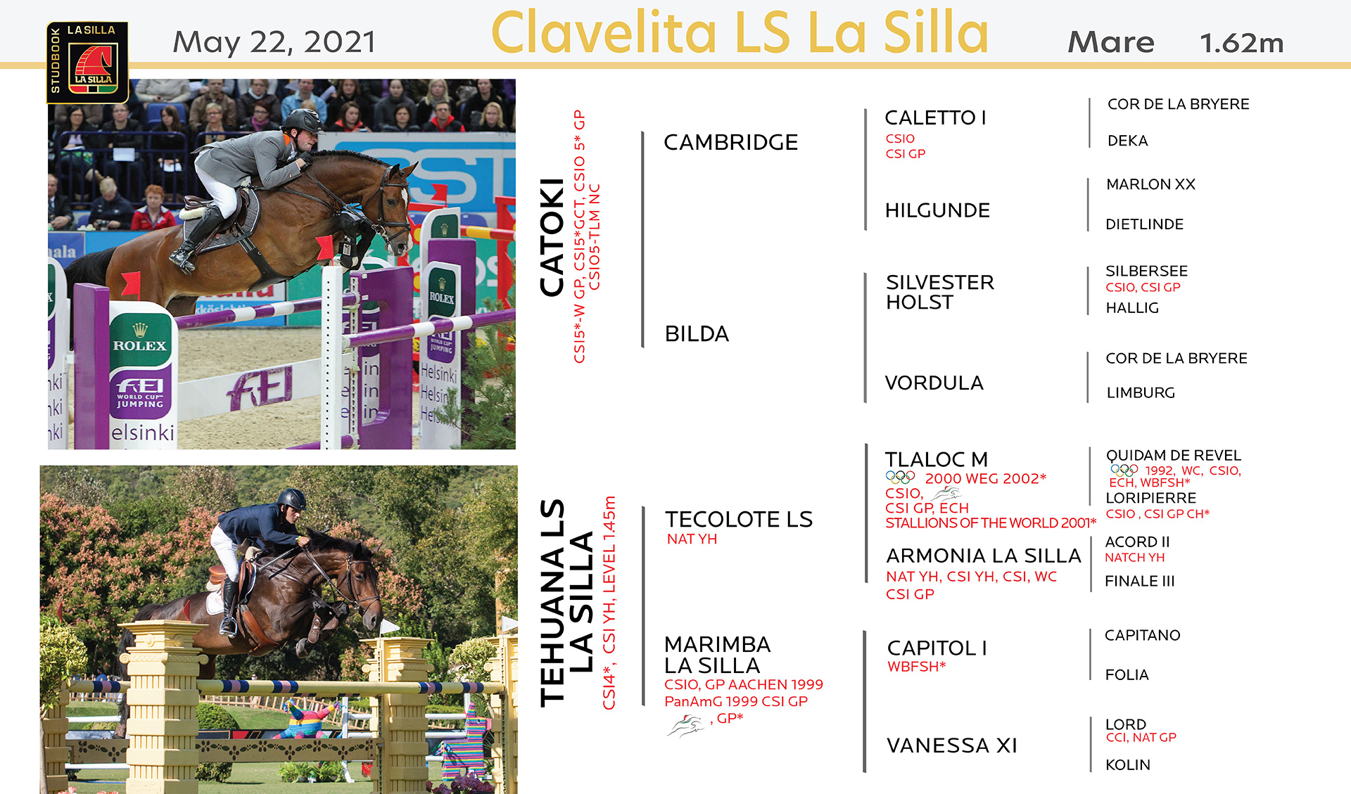 10mo. Lugar CSI4* (1.60m) München (GER) 2009; 1er.Lugar GP CSI5*-W (1.60m) Vigo (ESP) 2011;1er.Lugar GP CSI5*-W (1.60m) Bordeaux (FRA) 2011;8vo.Lugar CSIO5* (1.60m) Aachen(GER) 2011; 7mo.Lugar CSI5* GCT (1.60m) Valkenwaard(NED) 2012; 1er.Lugar CSIO5* (1.60m) Calgary, Spruce Meadows (CAN) 2012 montado por Philipp Weishaupt(GER) entre muchos más.