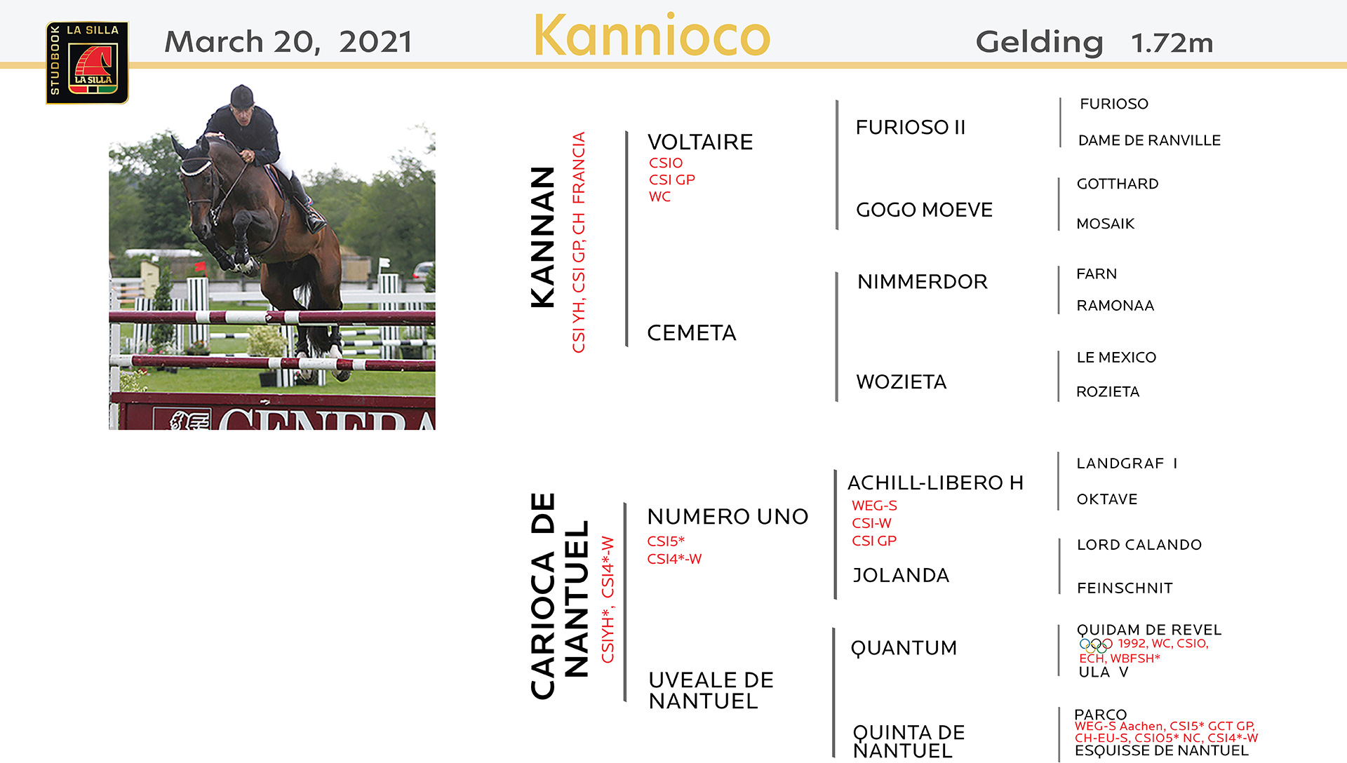Popular semental aprobado: Hann, Holst, ISH,KWPN, Old, SF, SI, SWB. Participó en CSI4*, CSI5* y Copas de Naciones, ganador CSI2* Approved Stallions 2005 Zwolle (NED) (1.50m) entre muchos más.