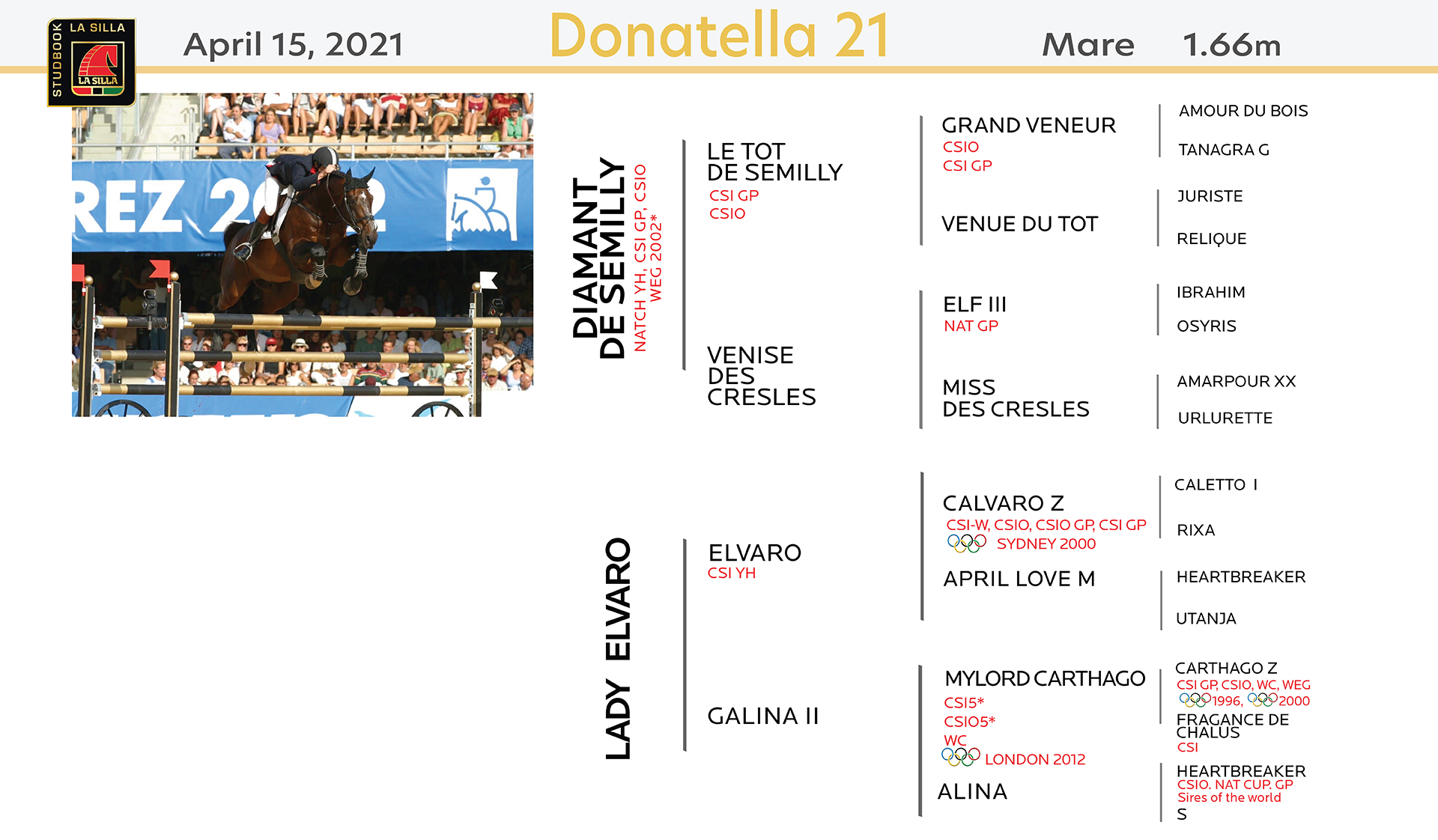 Su padre Mylord Carthago ha sido uno de los mejores caballos de salto del mundo antes de retirarse en 2014 y se ha convertido en uno de los sementales más buscados en Francia. Fue finalista en el Campeonato Mundial de Caballos Jóvenes de Lanaken en 4YO, 5YO y 6YO. Terminó 4to. en 7 YO.