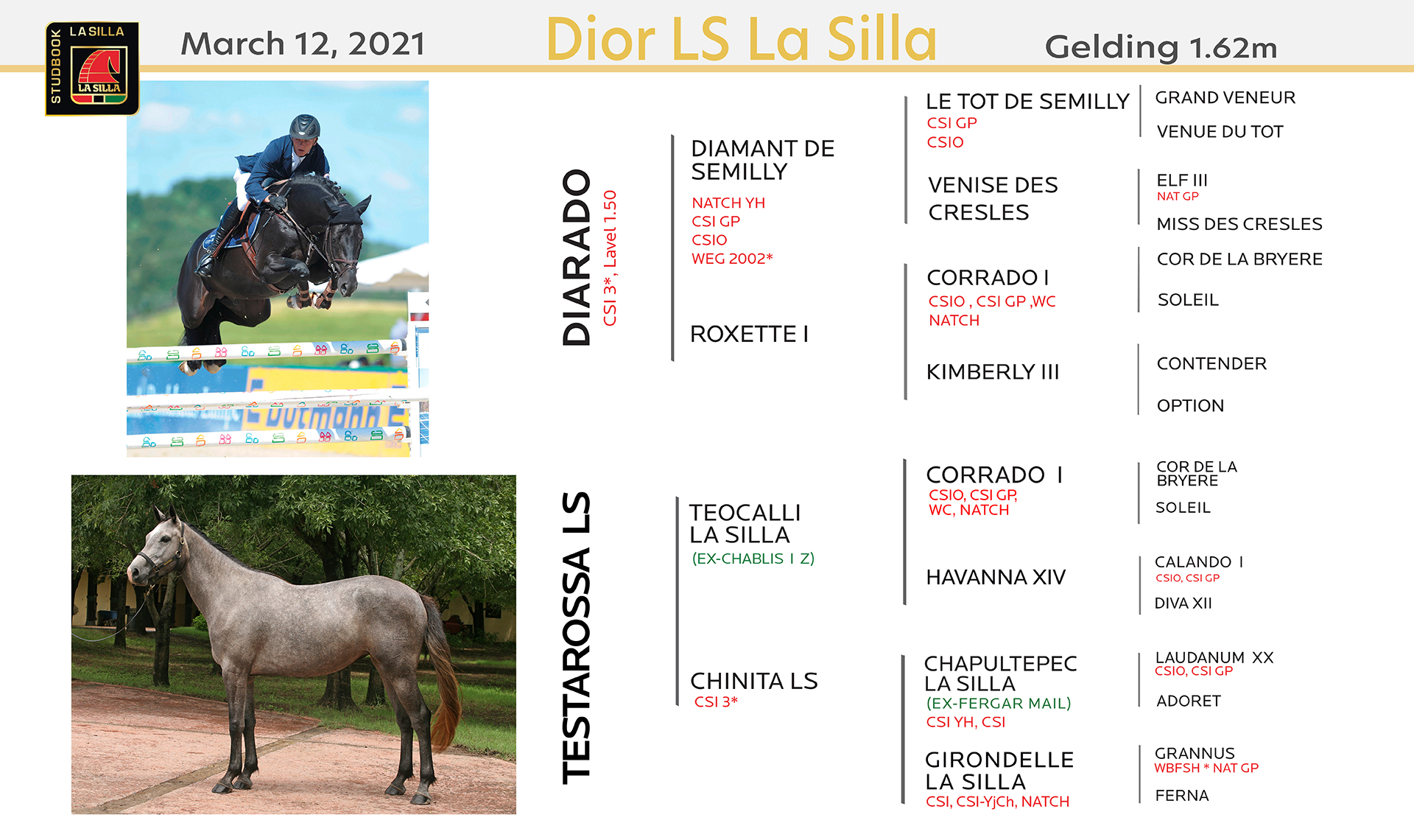 Semental aprobado por: Holst, Z; Su padre, Corrado I, ganador de la Copa del Mundo en Dortmund (GER) en 1994 y 1995, ganador del CSI GP en Kiel (GER) 1996, medalla de bronce en la Copa del Mundo en Ginebra (SUI) 1996 montado por Franke Sloothaak (GER).
