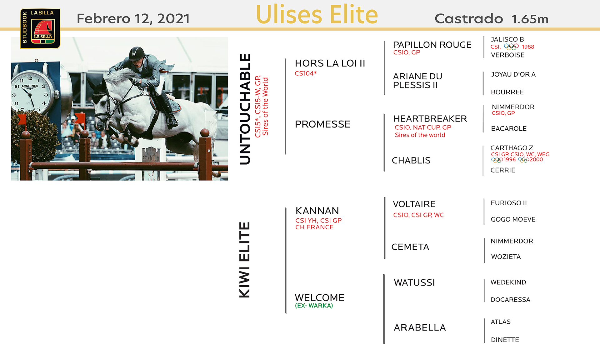 Aprobado por: KWPN, semental aprobado por: AES, BWP, KWPN, sBs, SF, SI,SWB ISJ (1.60m) montado por Michel Hecart (FRA) y Guido Bruyninx (BEL), 2do. Lugar CSI3* 2005 Deauville (FRA) (1.45m); 1er. Lugar CSI3* 2003 – GP 2003 Deauville (FRA) (1.50m); 1er. Lugar CSIO4* en la Copa de Naciones 2001 en La Baule (FRA); 1er. Lugar CSIO4* en la Copa de Naciones en Lisbon (POR) (1.60m) 2000; 2do. Lugar CSI3* GP La Courneuve (FRA) (1.50m) 2004 etc.